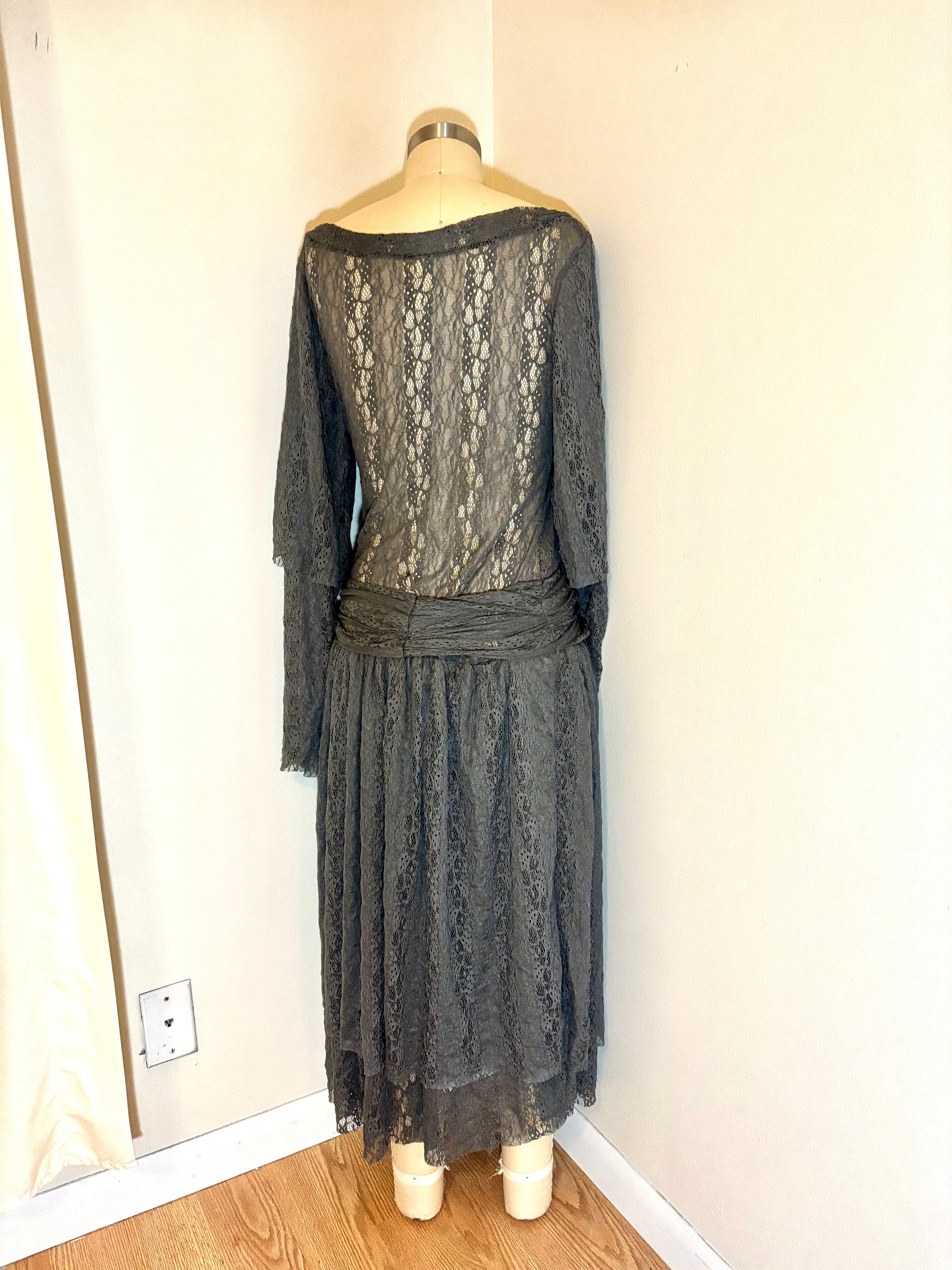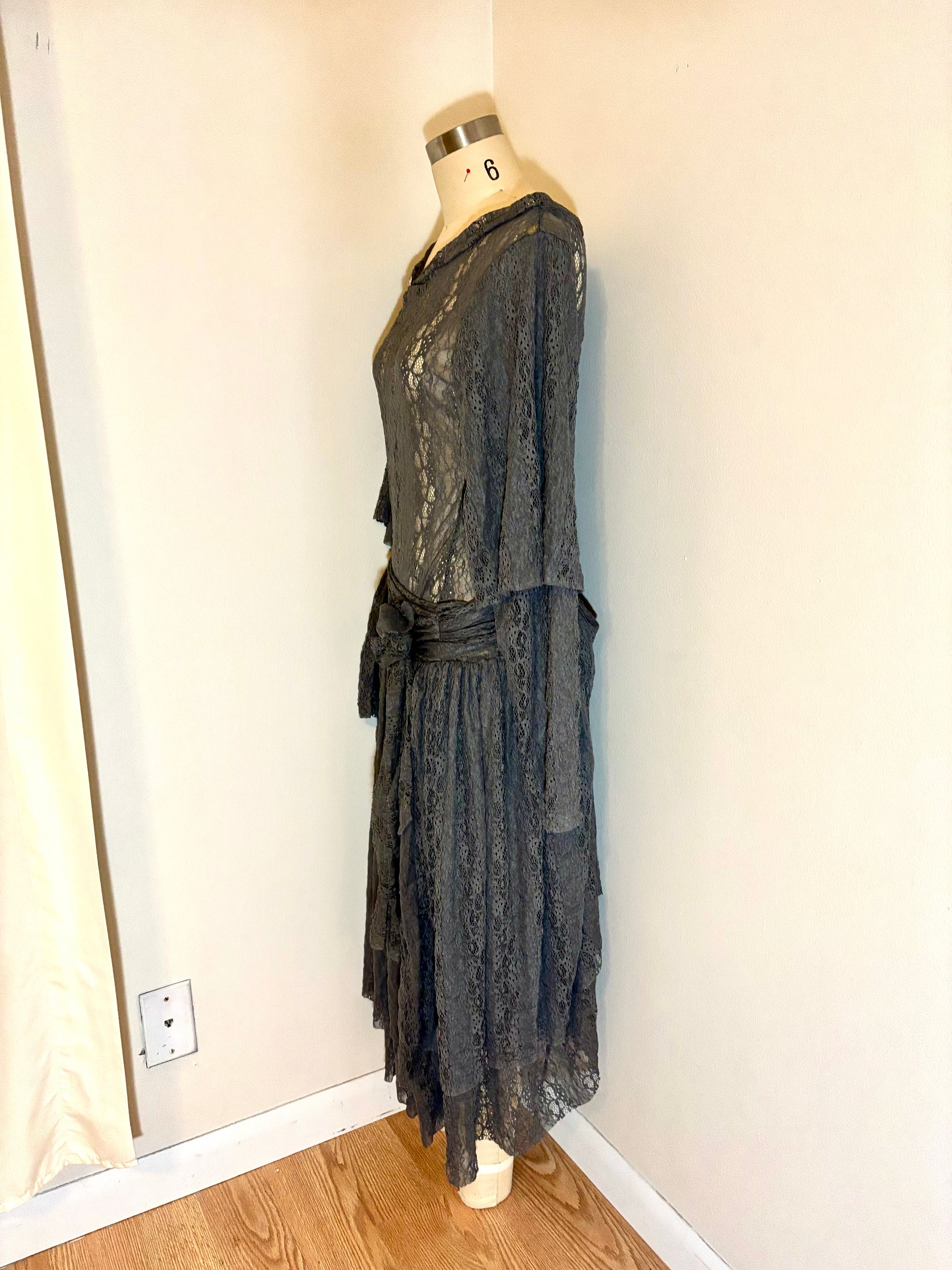 Grey lace drop-waist dress with layered detailing at the sleeves and skirt. Complete with charms at the neckline and waist.