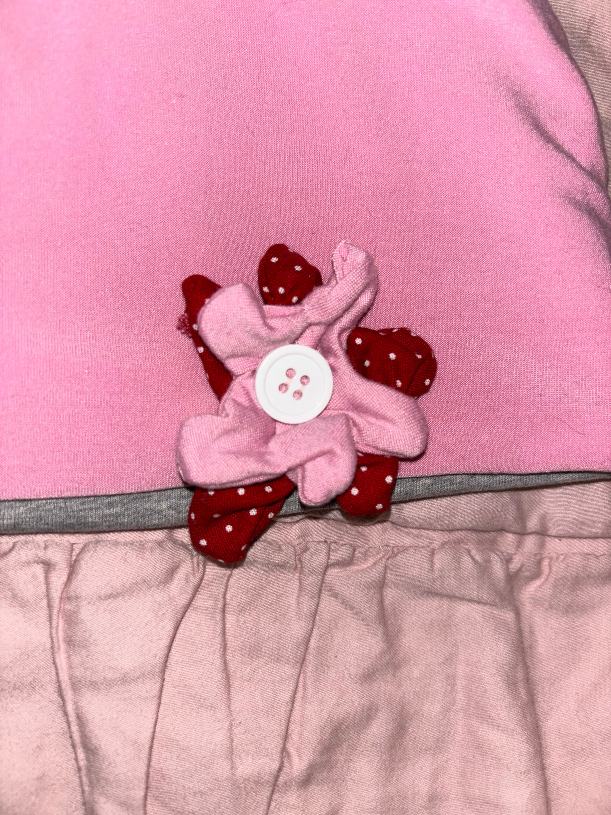Pink and Grey two-toned skullcap beanie with a flower appliqué made from scrap fabric sewn at the front with a cute little button.