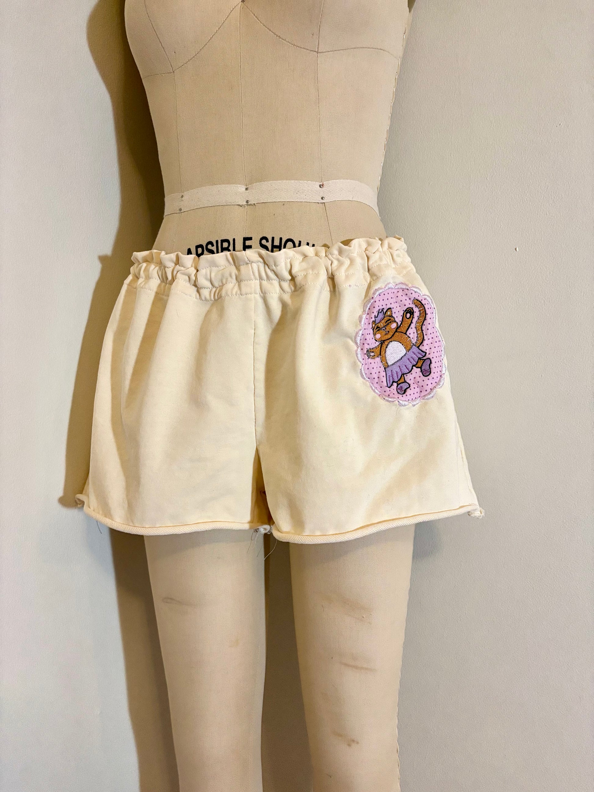 Terry sweatshorts with my ballet cat drawing embroidered on the left leg. Adjustable to fit with a drawstring waistband.